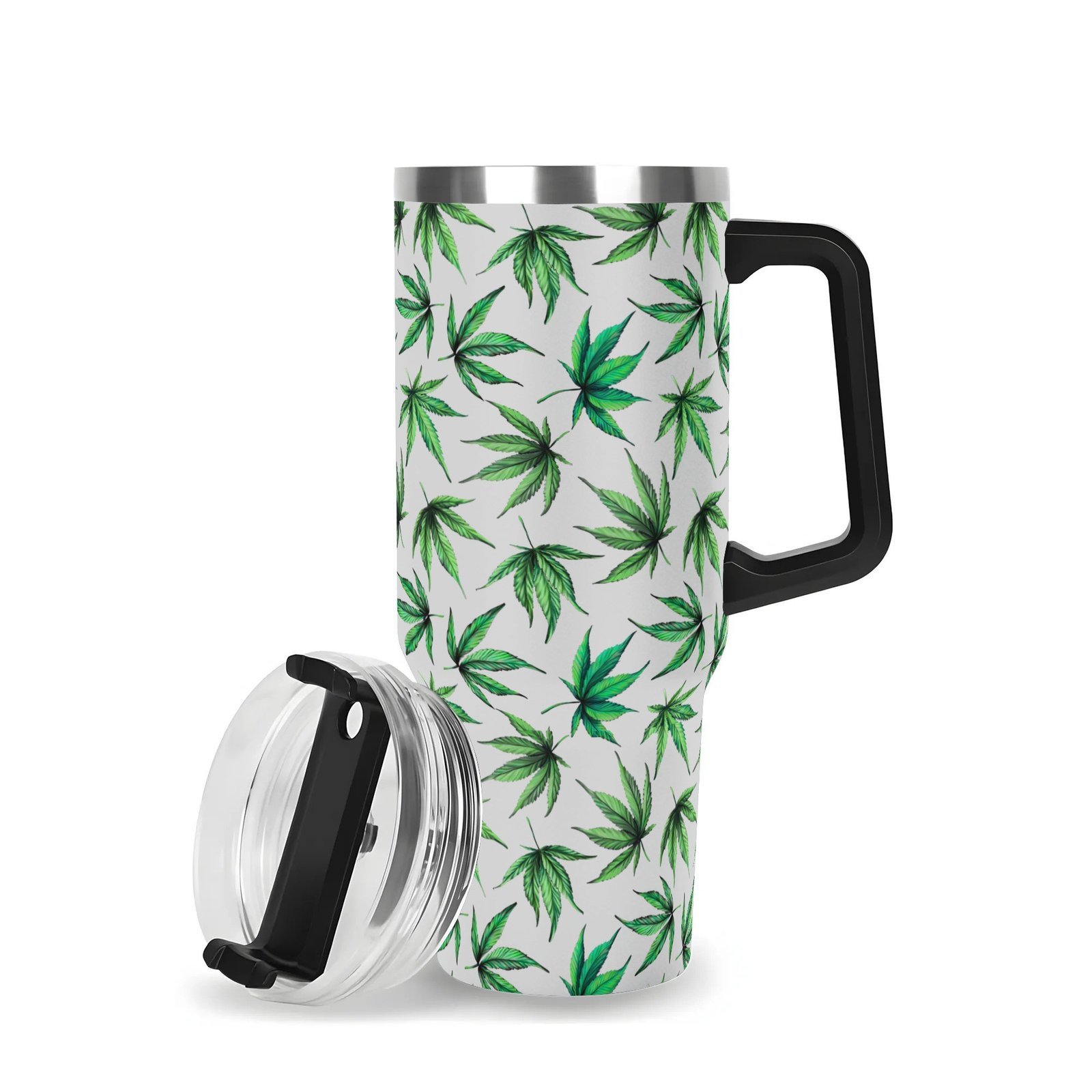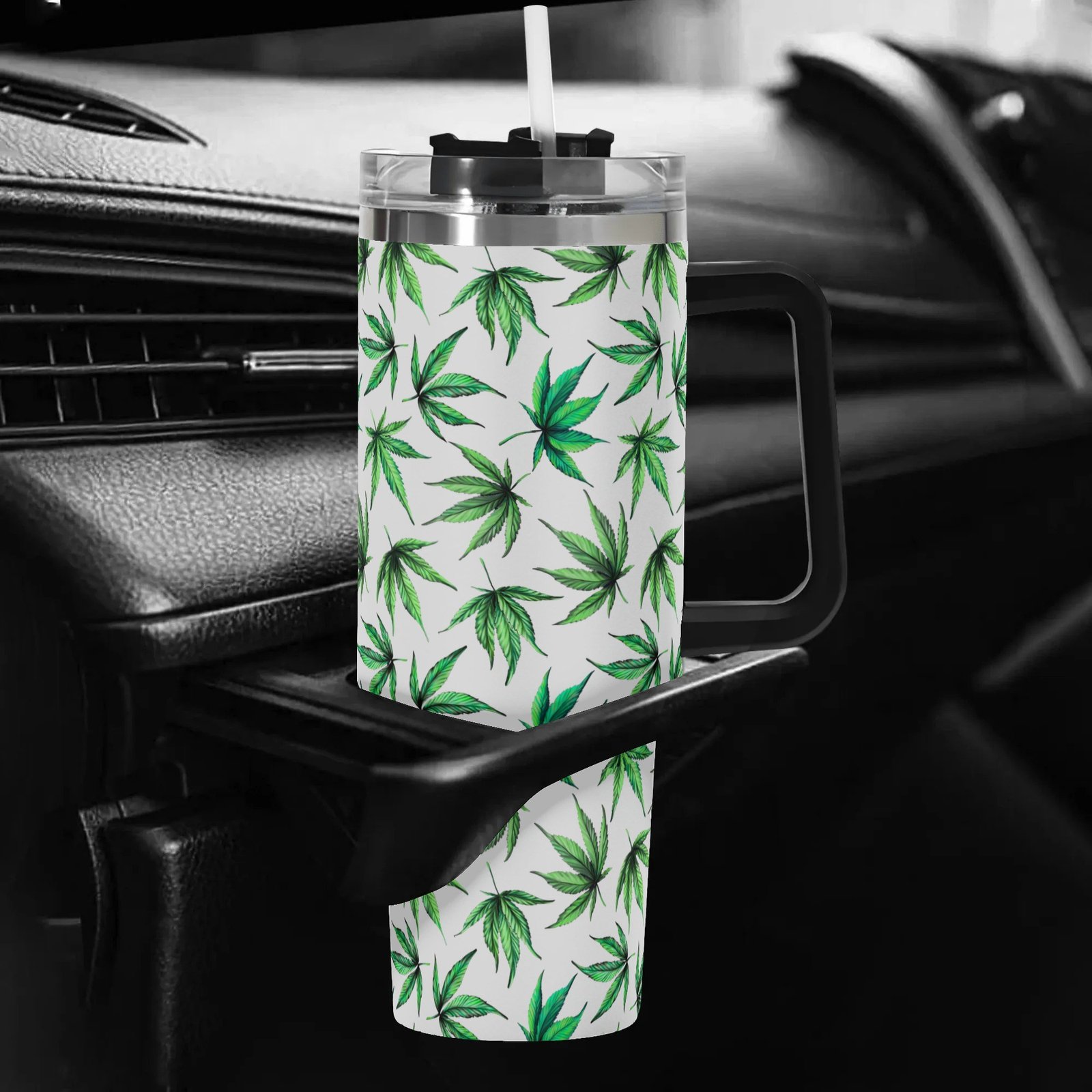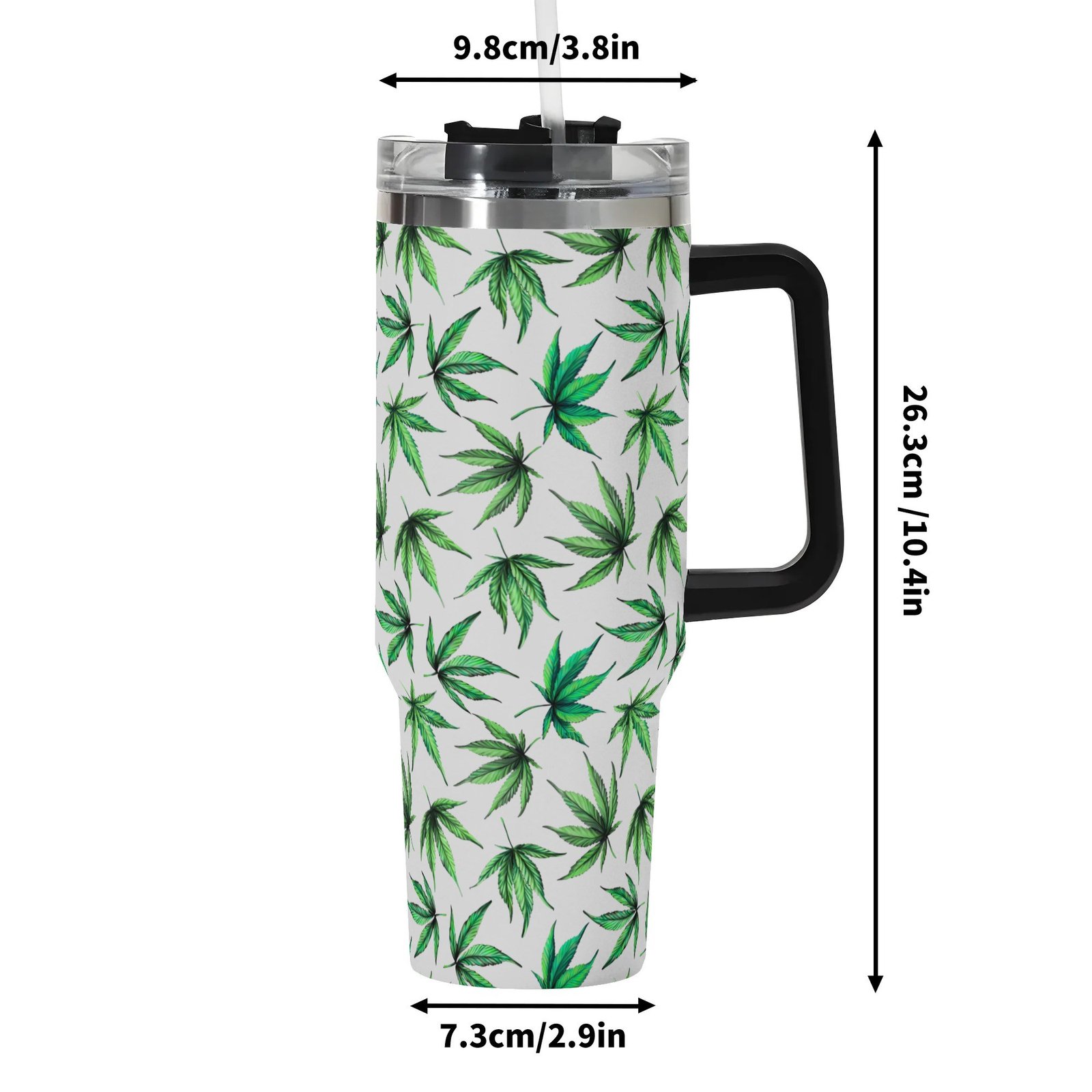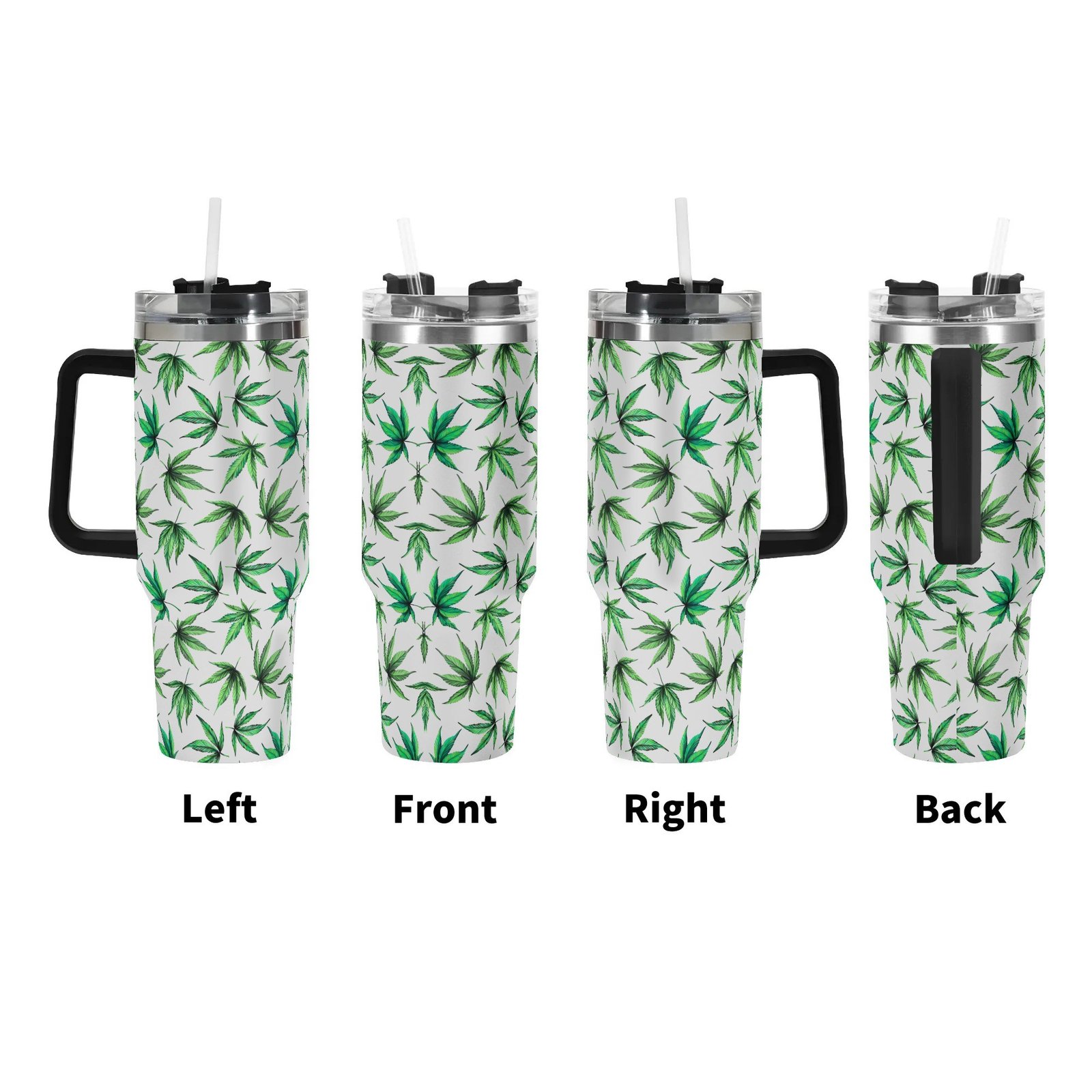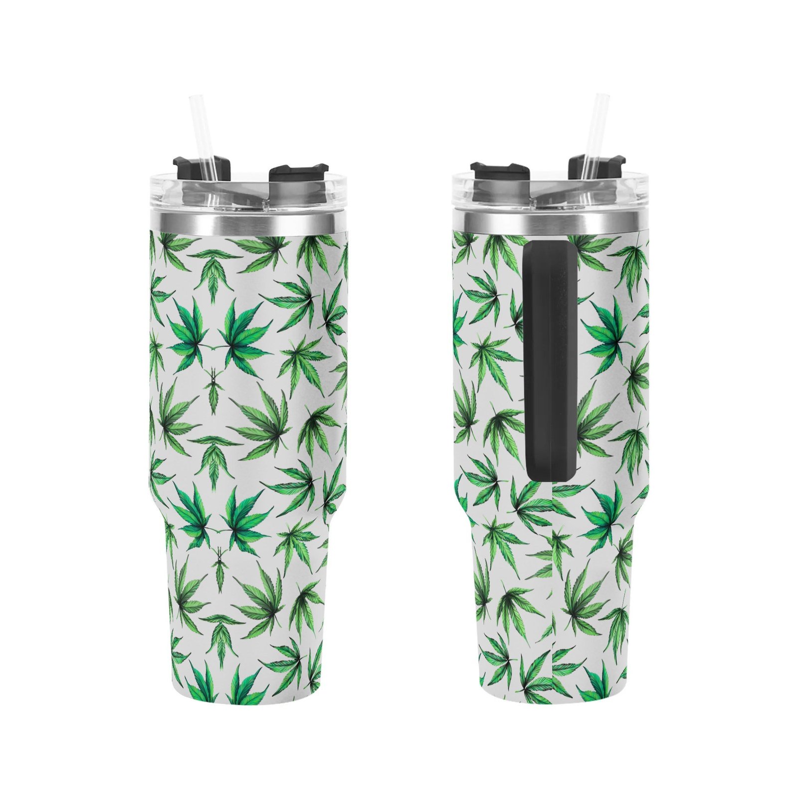 Personalized 40oz Stainless Steel Tumbler With Black Handle and Straw- Leaves Designs