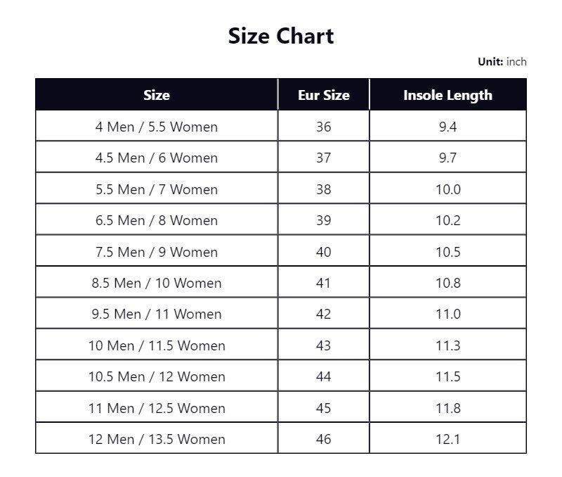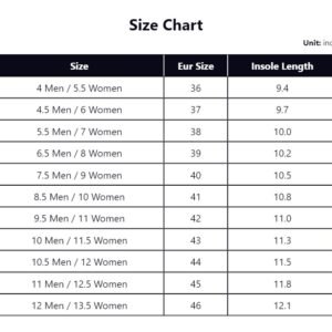| 10 Men / 11.5 Women | 43 | 28.7 |