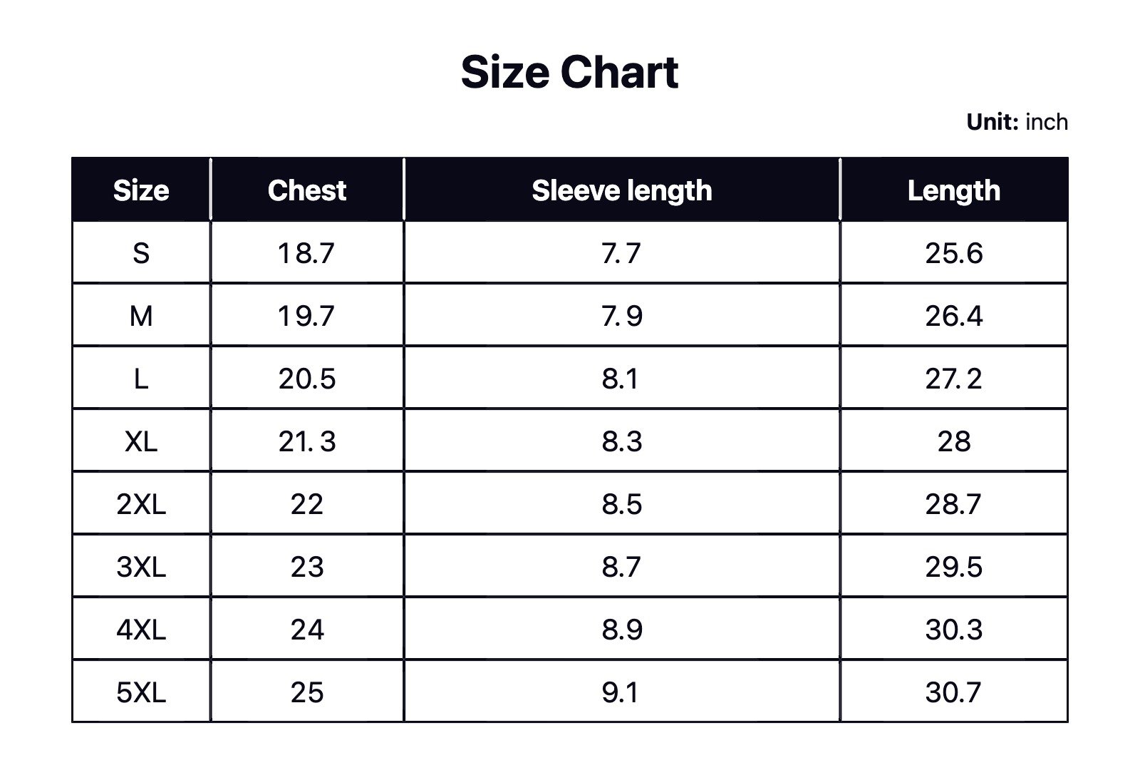 | Size | Chest(cm) | Sleeve length(cm) | Length(cm) |